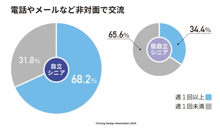 週1回以上、対面で誰かと会っている自立シニアは約60%、低自立シニアは約30%と、自立シニアの半分に過ぎない。自立シニアは、電話やメールなどの非対面の交流にも積極的で約70%。自立シニアは、積極的にコミュニケーションをとる傾向にある。